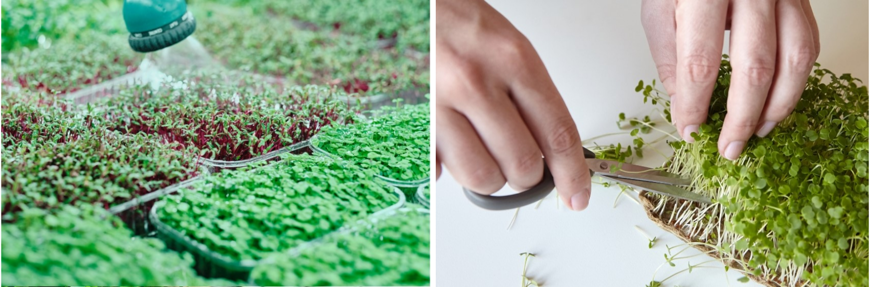 5. การดูแลและเก็บเกี่ยว: รดน้ำให้พืชเปียกชุ่มเมื่อดินแห้ง แต่ไม่ควรทำให้น้ำขัง หลังจากที่ไมโครกรีนเริ่มงอกและเจริญเติบโตเต็มที่ในระยะเวลาประมาณ 7-14 วัน สามารถเก็บเกี่ยวได้โดยการตัดด้วยกรรไกรหรือกรรไกรตัดผักในช่วงที่เป็นยอดอ่อนที่ต้องการ